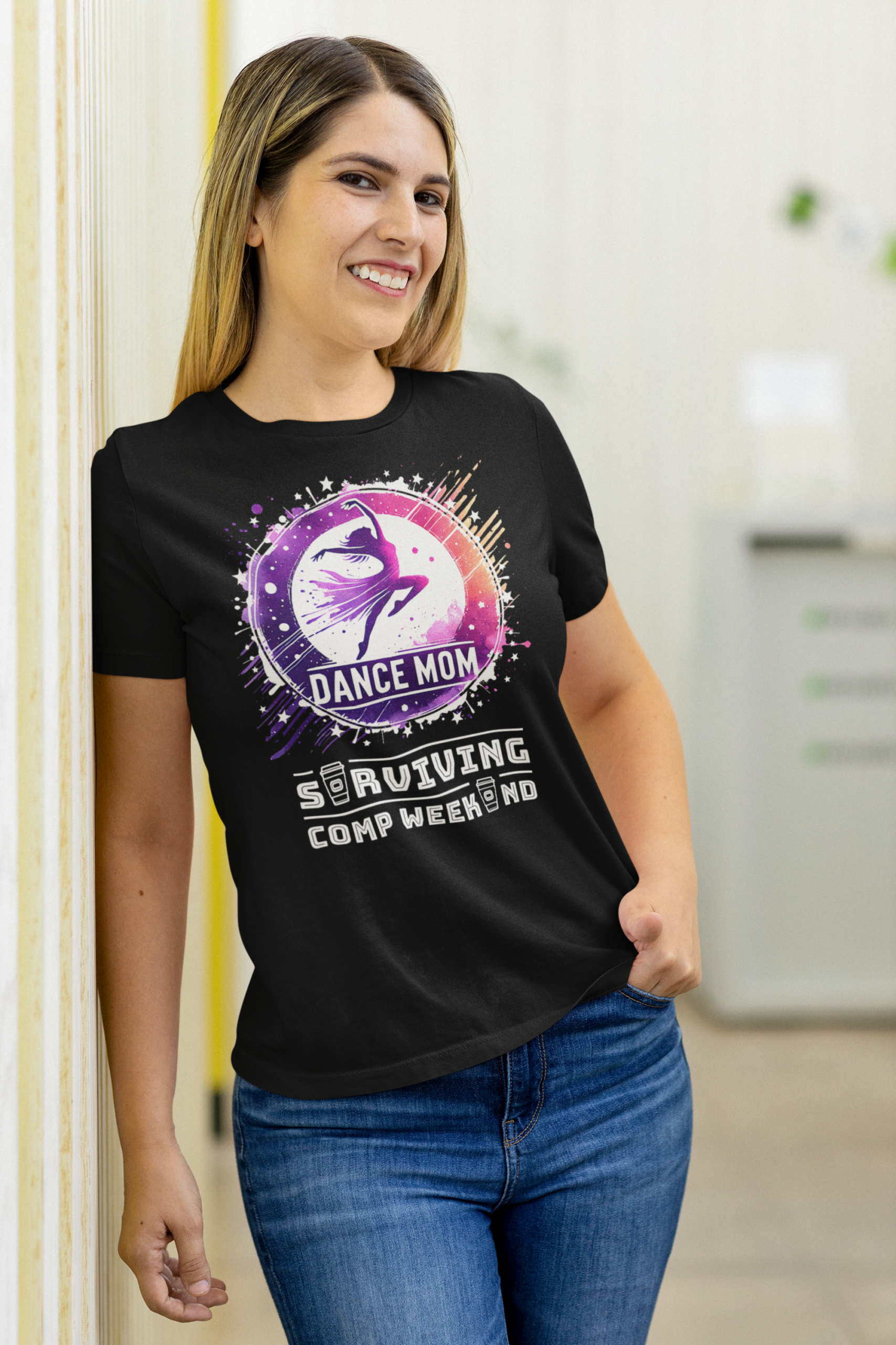 Tricoul „Dance Mom – Surviving Comp Weekend” este dedicat mamelor care rezistă maratoanelor de concursuri, programelor încărcate și emoțiilor din backstage. Designul vibrant, cu siluetă de balerină și accente mov-roz, transmite energie, susținere și mândrie.